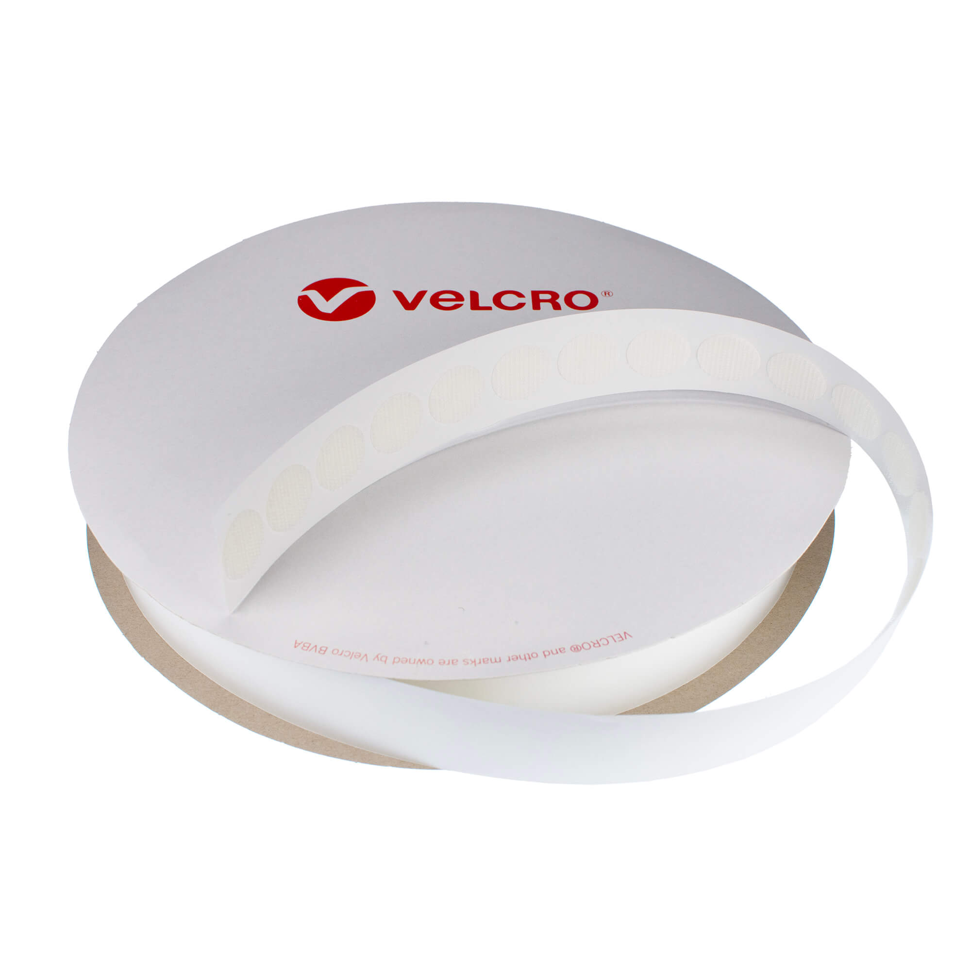 White 22mm VELCOIN® hook coins with PS14 rubber resin adhesive, these are die-cut on 25 metre rolls that contain approx. 1000 hook dots. Suitable for use on most surfaces including paper, card, rigid plastic, glass and metal. VELCRO® Brand coins are widely used for crafts, schools and colleges they are also used widely in the exhibition, display and packaging industry.